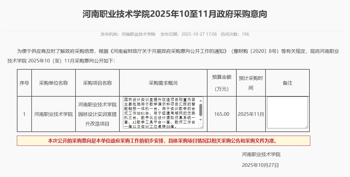 河南职业技术学院2025年10至11月政府采购意向