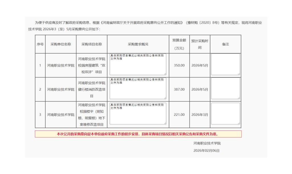 河南职业技术学院2026年3至6月政府采购意向