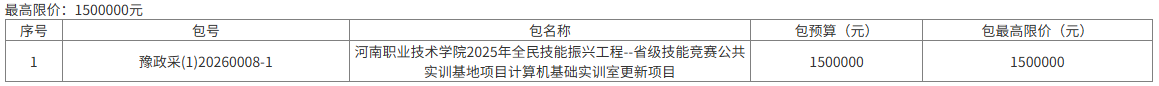 河南职业技术学院2025年全民技能振兴工程--省级技能竞赛公共实训基地项目计算机基础实训室更新项目招标项目的潜在投标人应在河南省公共资源交易中心网(hnsggzyjy.henan.gov.cn)。获取招标文件,并于2026年01月28日09时00分(北京时间)前递交响应文件。